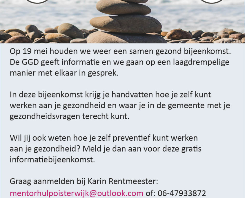 Op maandag 19 mei houden we weer een SAMEN GEZOND bijeenkomst.