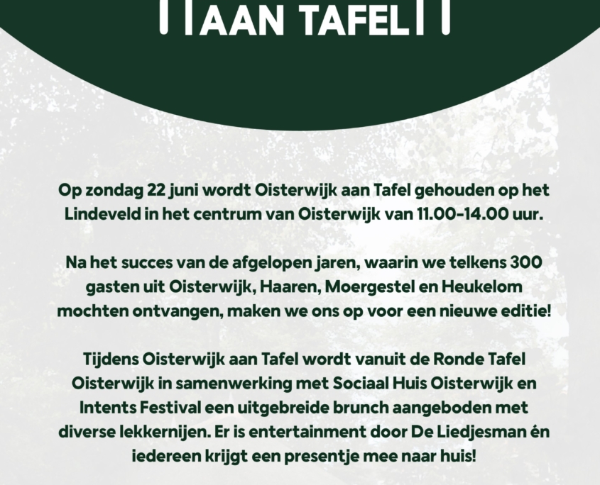 Op zondag 22 juni wordt Oisterwijk aan Tafel gehouden op het Lindeveld in het centrum van Oisterwijk van 11.00-14.00 uur.