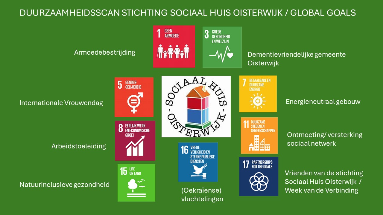 Stichting Sociaal Huis Oisterwijk maakt deel uit van het Global Goals Genootschap Oisterwijk en draagt op haar manier een steentje bij aan een duurzame ontwikkeling voor de inwoners van de gemeente Oisterwijk.