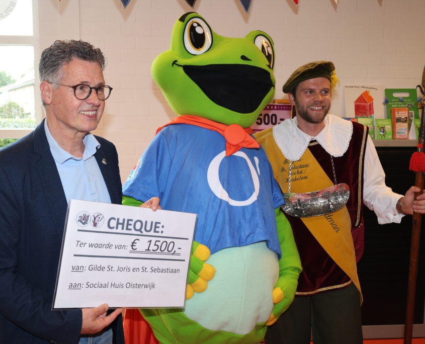 O’pkikker, de mascotte van de stichting, mocht daarom uit handen van de gildekoning een cheque ontvangen van € 1.500,00 om het goede werk van de Stichting te ondersteunen. De blij verraste voorzitter Eric Rentmeester nam op zijn beurt de cheque van de mascotte in ontvangst en bedankte de gildebroeders en zusters hiervoor.